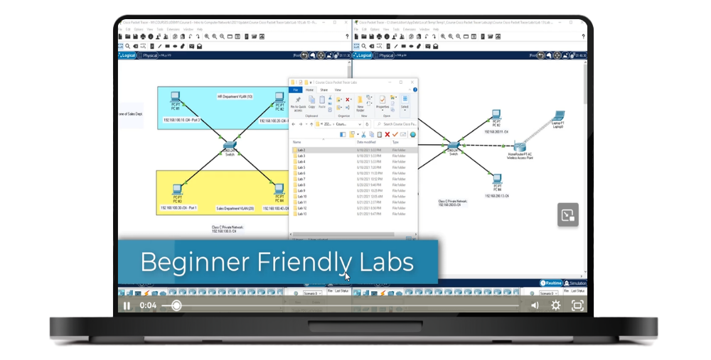 Cisco Packet Tracer is free network simulation software that lets you build and configure networks in a safe, virtual environment. You'll need to register with Cisco (free registration) to download the software, which works on both Windows and Mac. The course includes 13 beginner-friendly labs with both start files and completed solution files. Each lab progressively builds your skills, and you can compare your work to the solutions if you get stuck.
